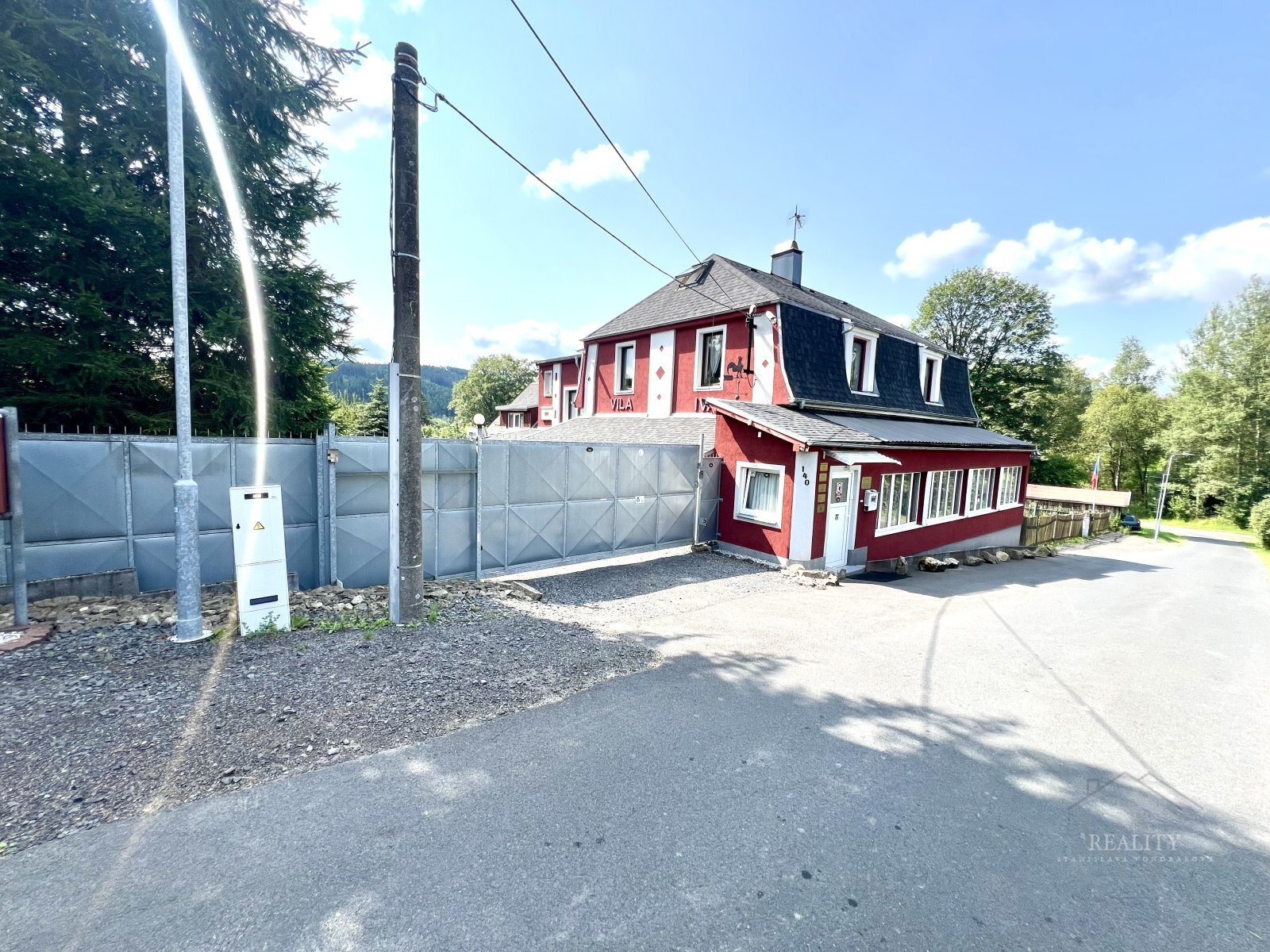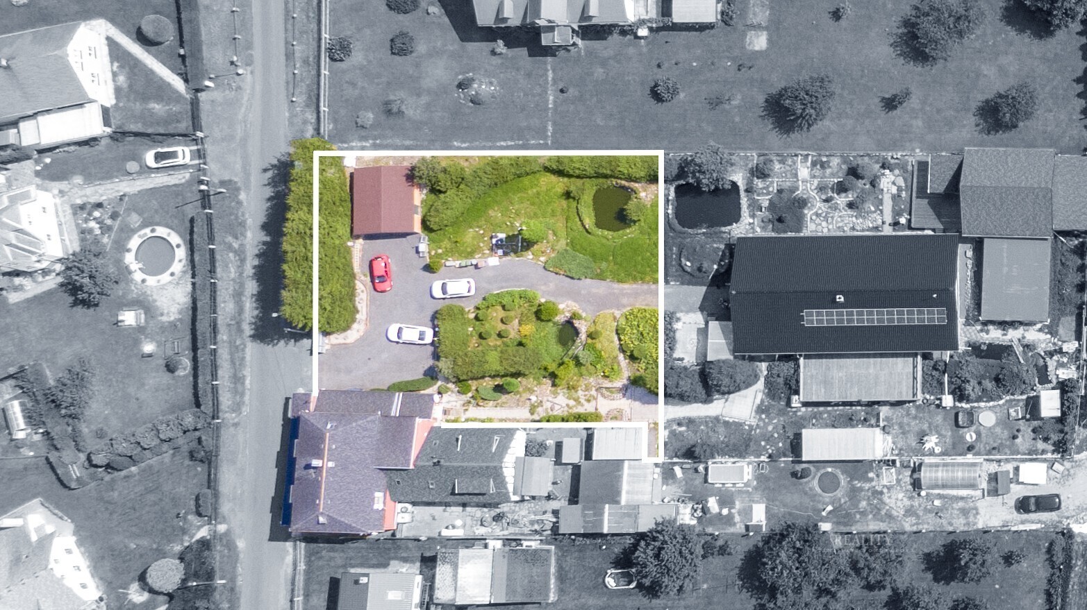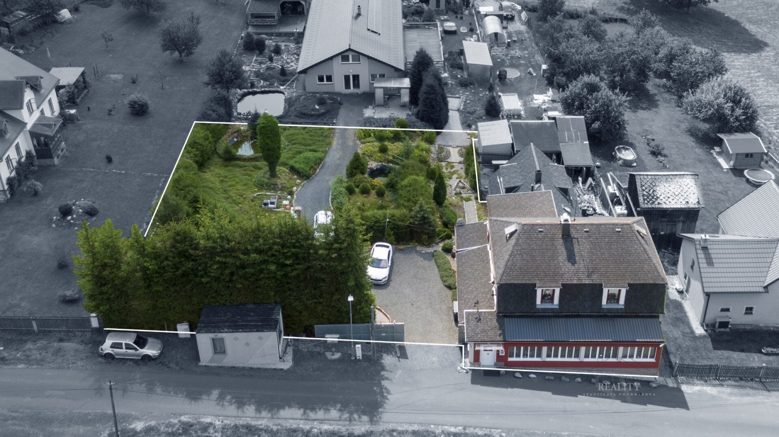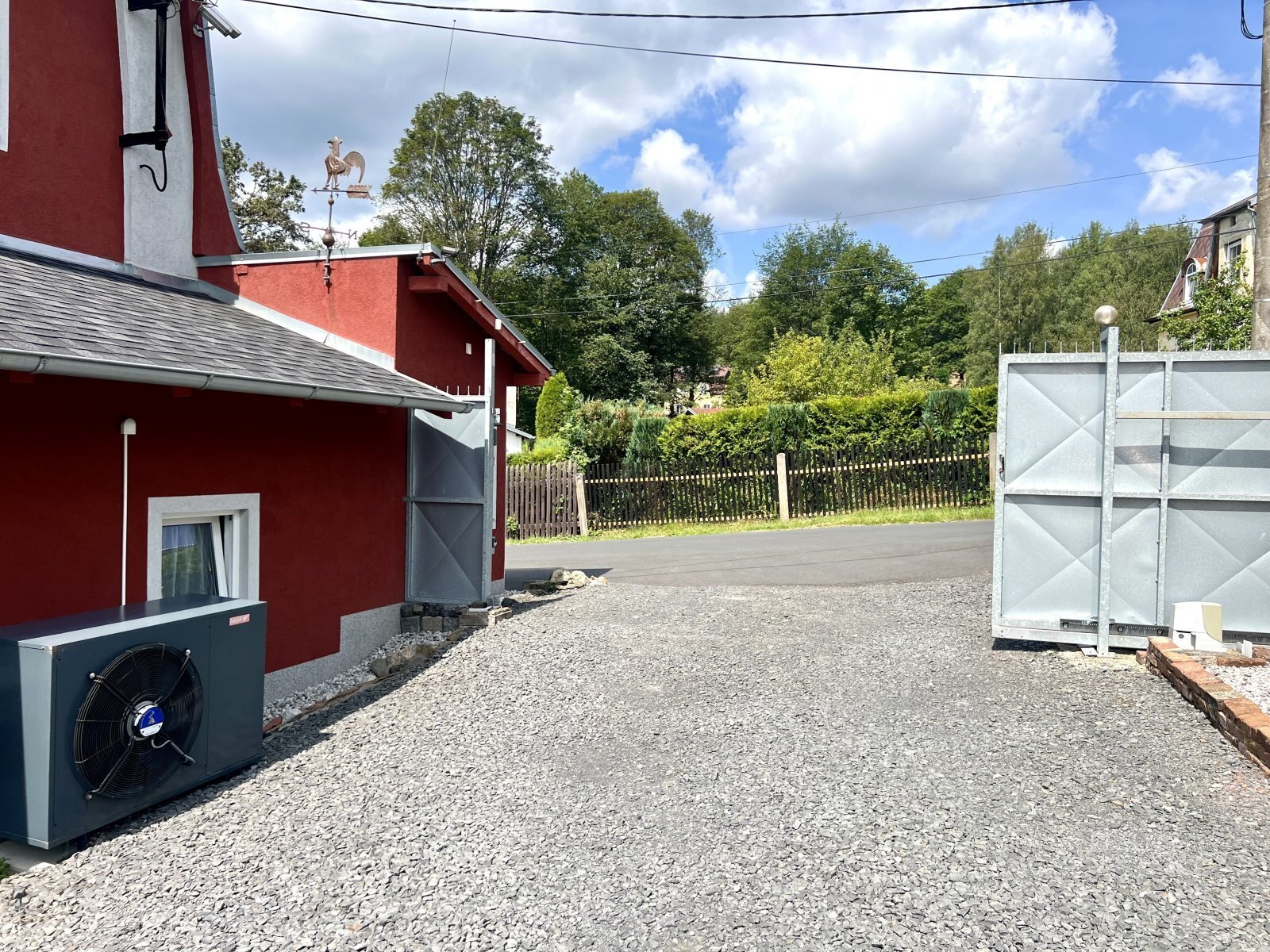 Nemovitost je plně oplocena a disponuje vlastní příjezdovou cestou zakončenou velkou ocelovou bránou na dálkové ovládání. Za ní se nachází prostorné nádvoří, které poskytuje dostatek místa pro parkování i pohodlné užívání.