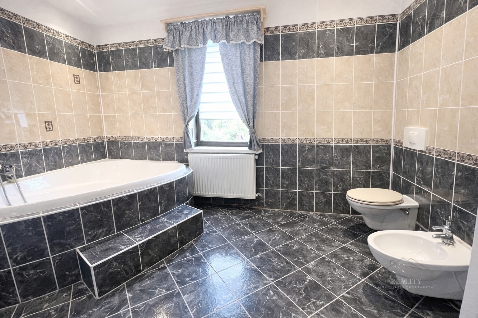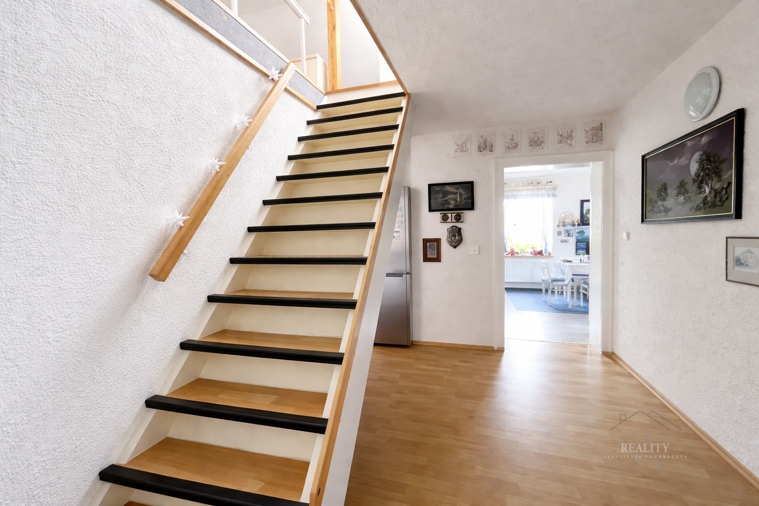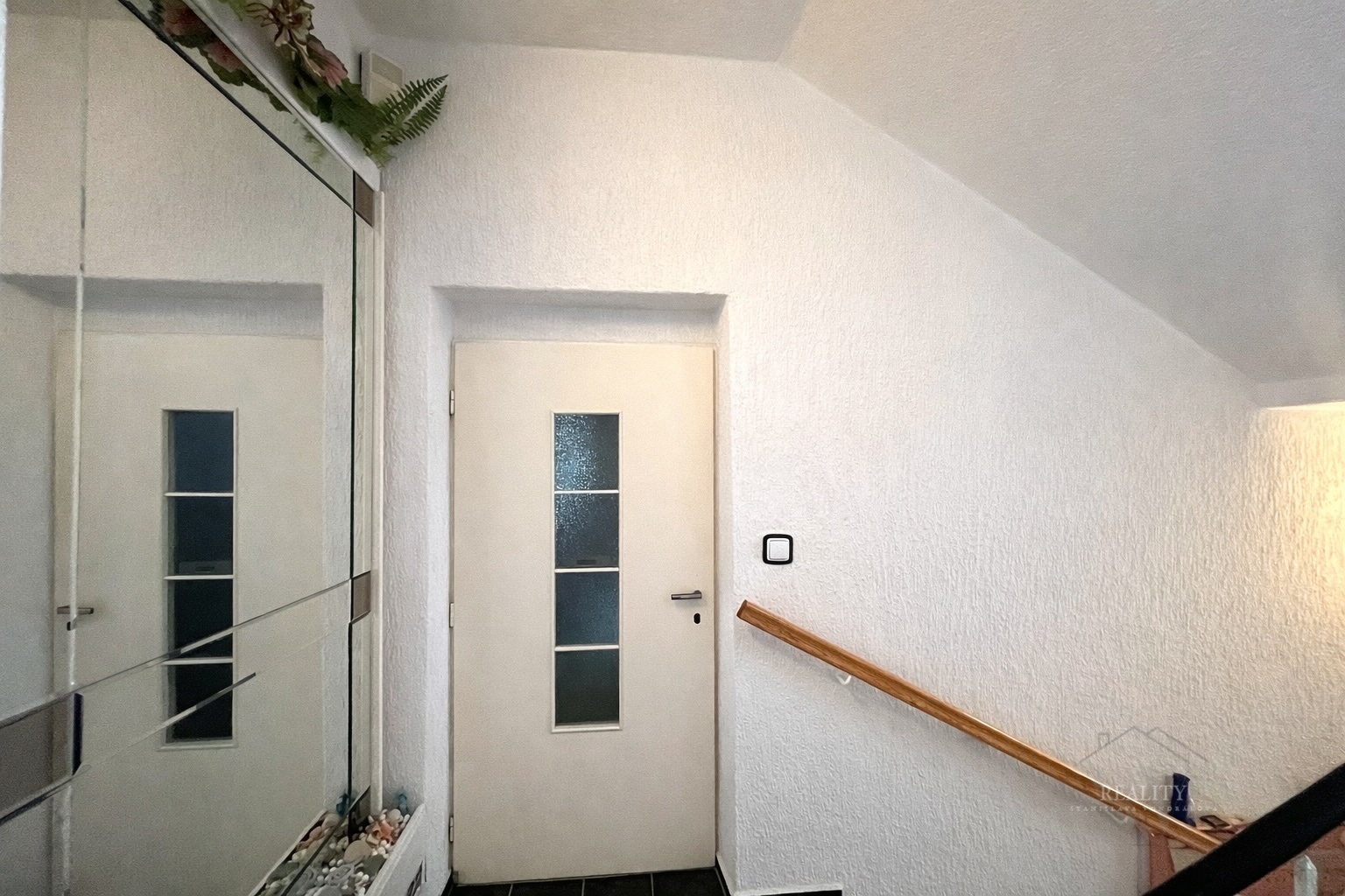 Nabízí zádveří, spíž, vstupní chodbu, kuchyň, obývací pokoj, koupelnu s velkou rohovou vanou a společným WC, ložnici, pokoj a schodiště do podkrovního pokoje (55 m²).