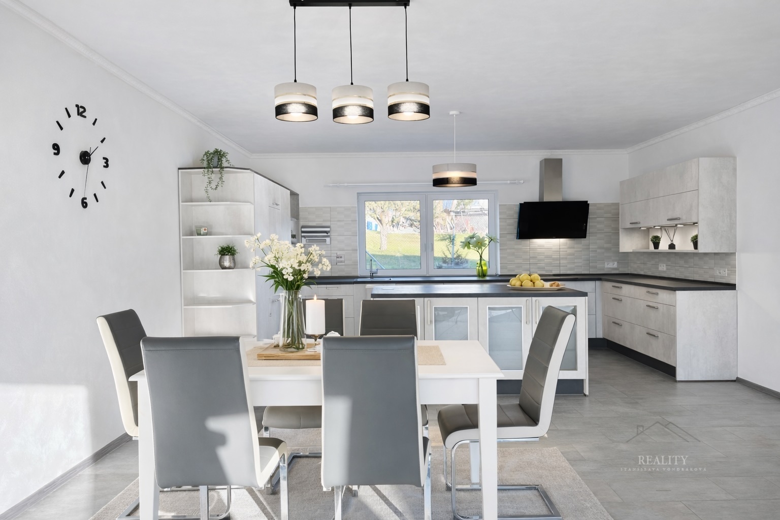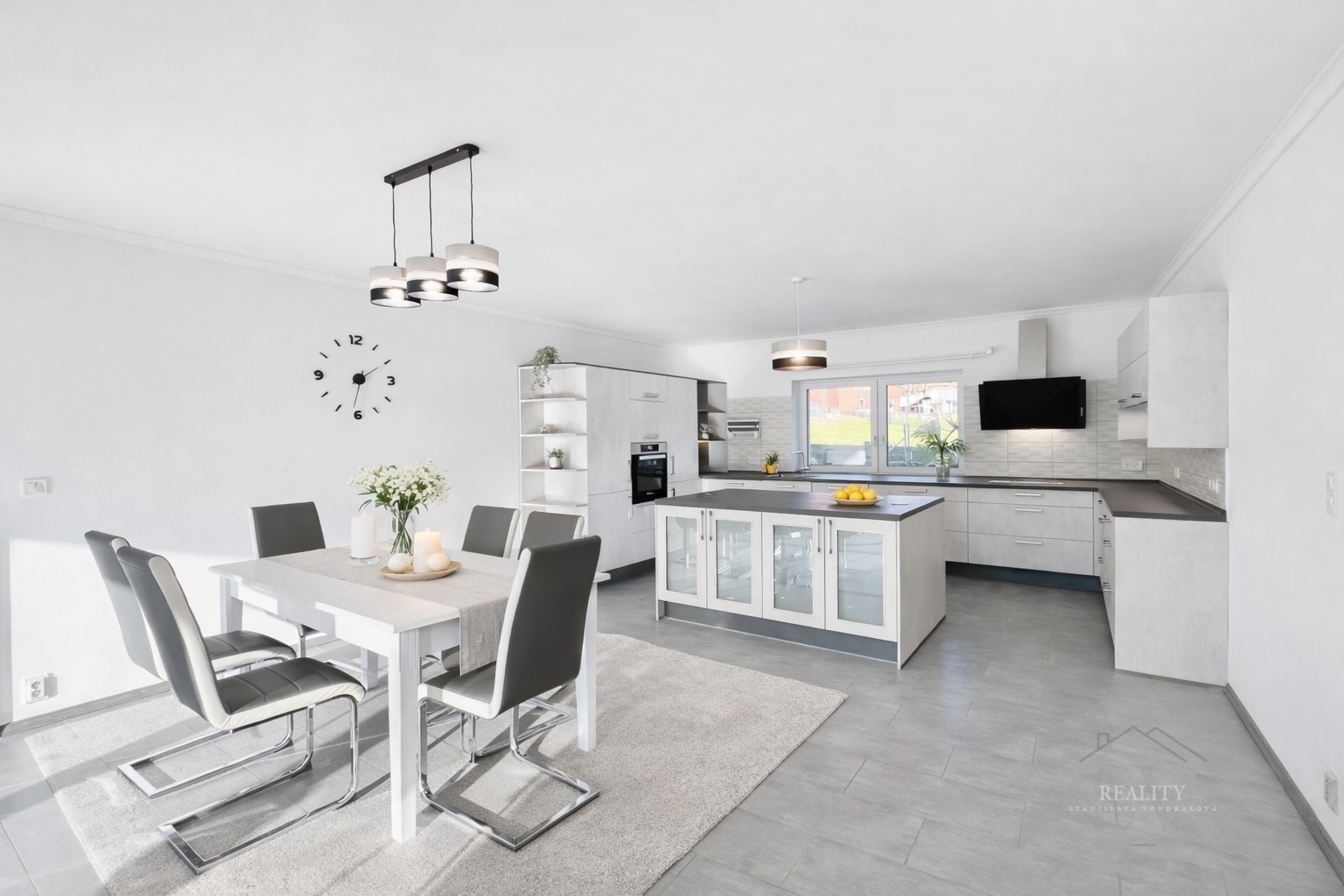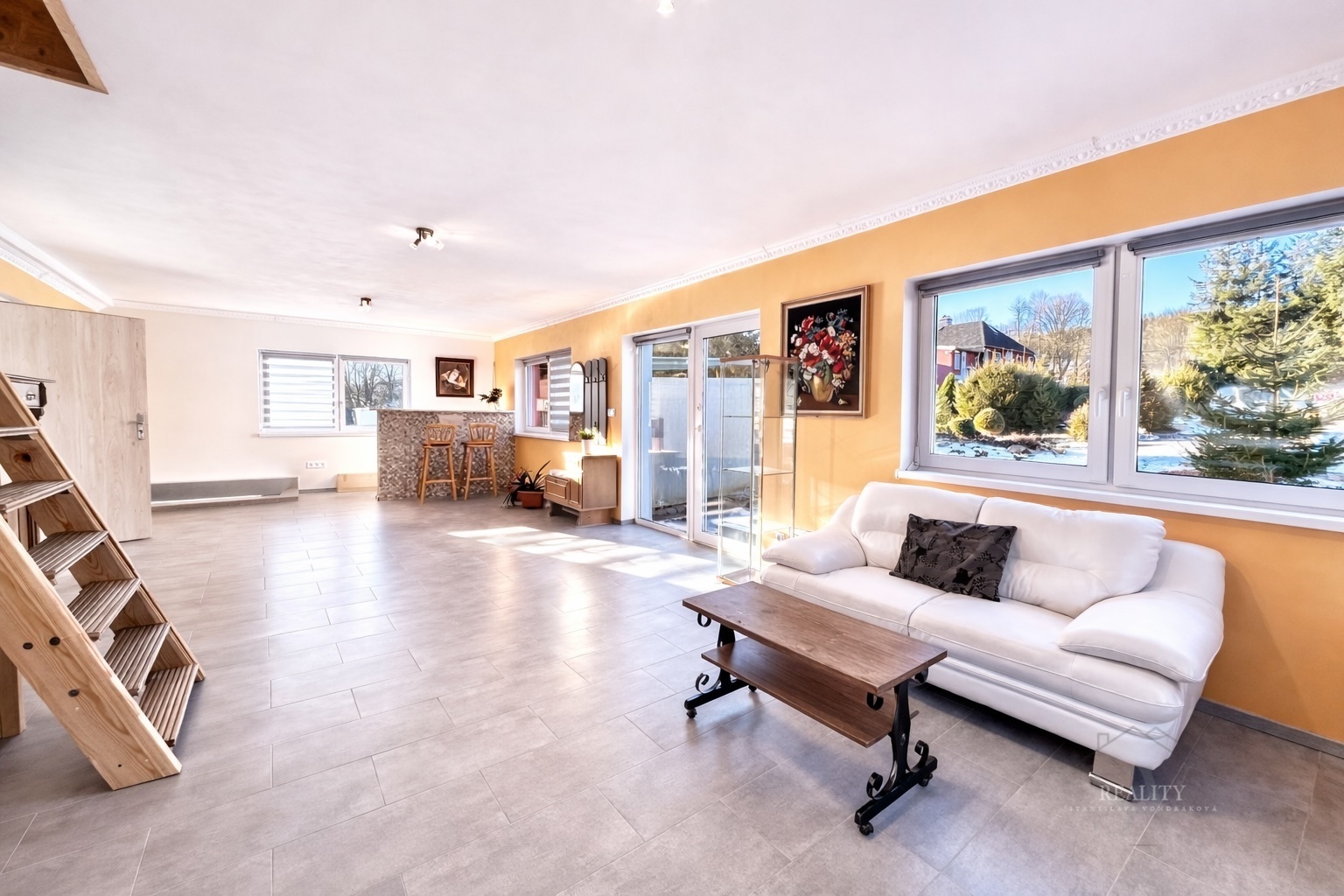 Dominantou domu je prostorný obývací pokoj s přípravou na krb, plynule propojený s designovou kuchyní a jídelnou. Odtud je přímý vstup na velkou terasu (80 m²), která nabízí jedinečné soukromí a nádherné výhledy. Na terasu navazují i vstupy z dalších pokojů, což podtrhuje vzdušnost celého domu.
