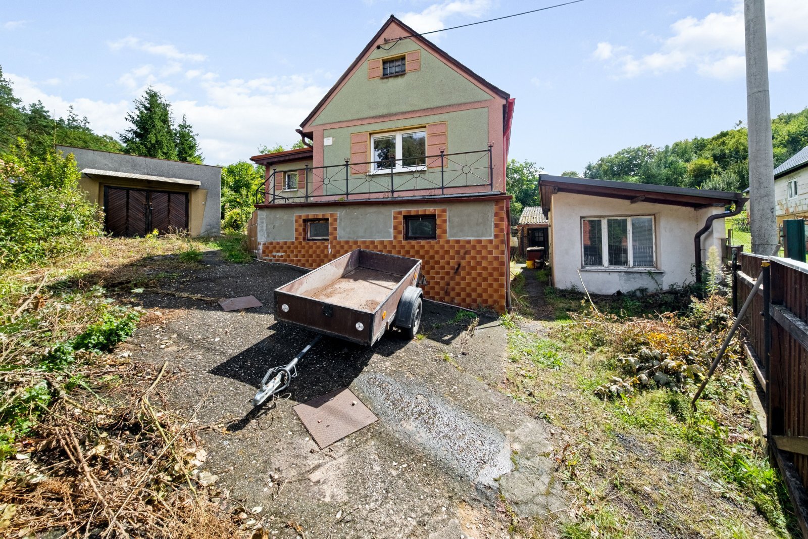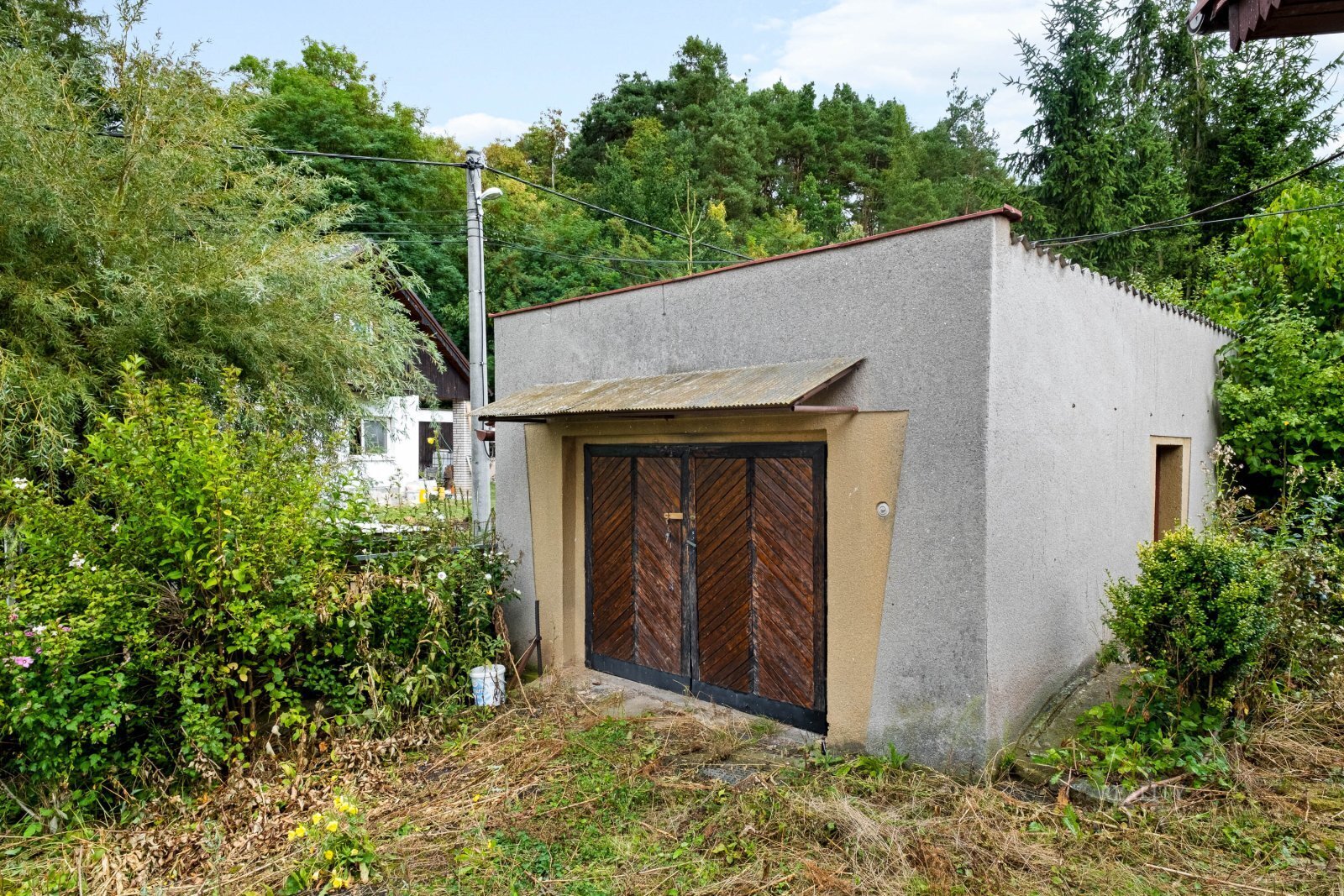 Součástí pozemku je prostorná garáž s montážní jámou, ideální pro automechaniky či kutily, a také menší zahradní domek s krbem, který lze snadno upravit na příjemné letní posezení s grilem.