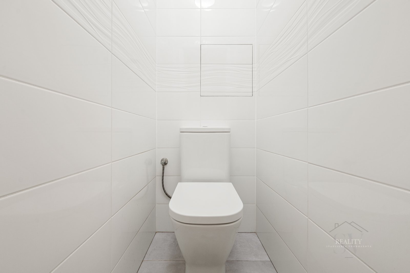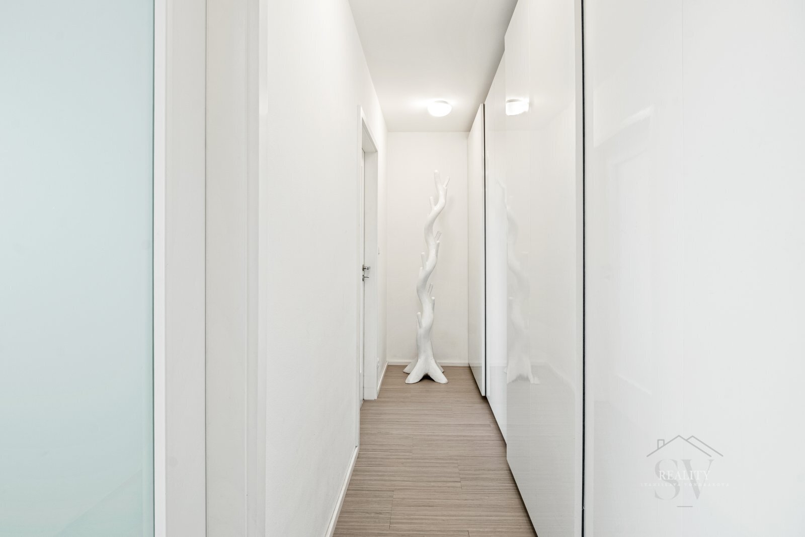 Interiér prošel precizní rekonstrukcí s důrazem na materiály a funkčnost. Samozřejmostí je kuchyň na míru s ostrůvkem, vestavěné spotřebiče, sklokeramická varná deska a komínový odsavač s možností barového sezení. Designová koupelna se sprchovým koutem, oddělené WC, nové rozvody a elektroinstalace, marmoleum na podlahách (odolné, tiché, snadno udržovatelné). Maximálně využitý úložný prostor: vestavné skříně v bílém lesku v chodbě (včetně botníku) a promyšlené prvky v koupelně; pračka skrytá v chodbové skříni + příprava na sušičku – interiér působí čistě a vzdušně.