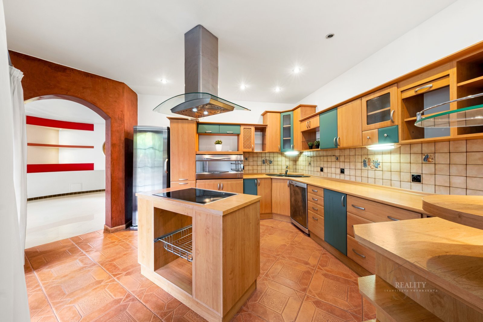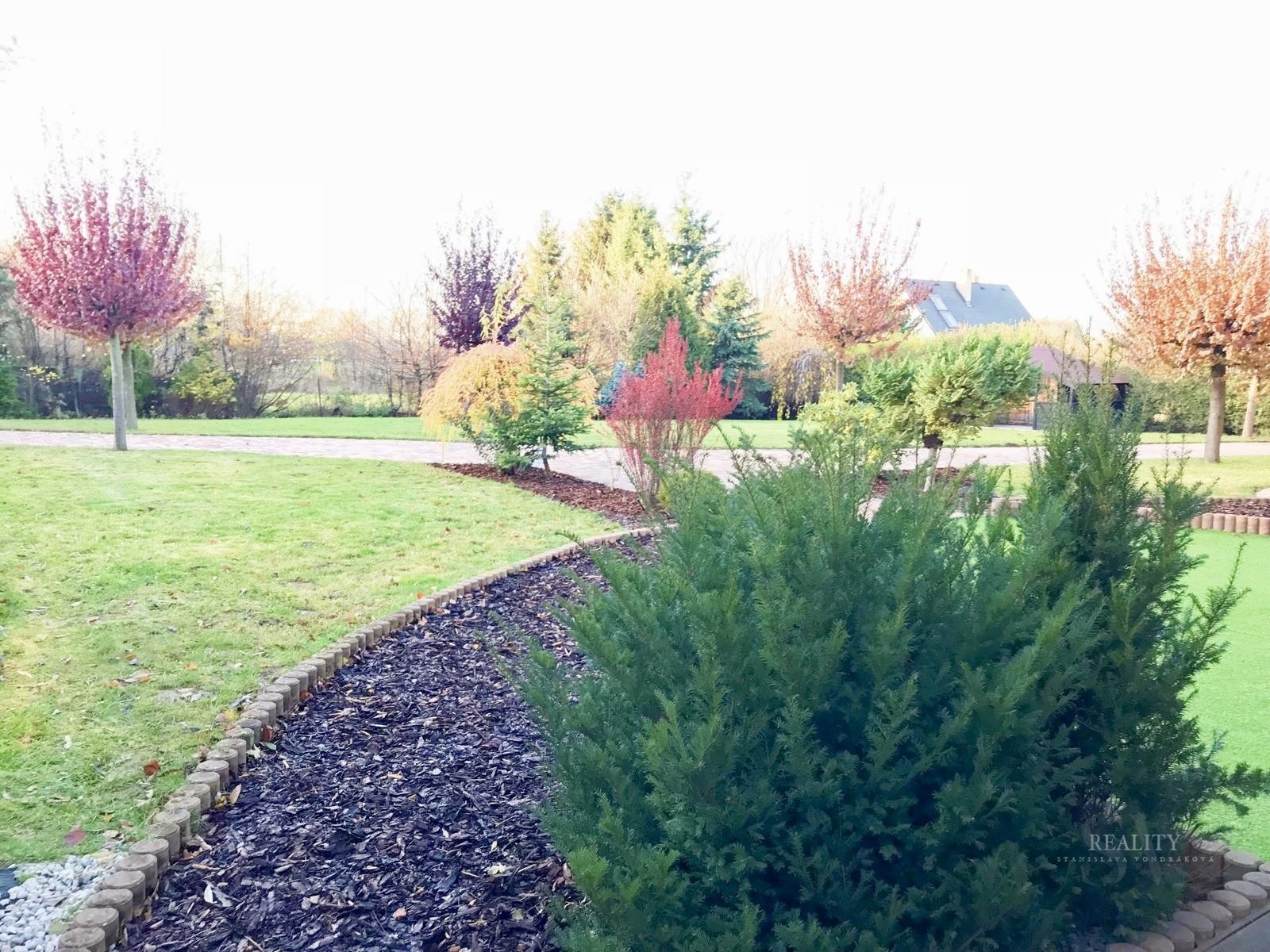Wellness plocha není započtena do uvedené užitné plochy domu – uváděna zvlášť, přímý vstup z domu do wellness zóny a na nádherně členitou zahradu o 1 738 m² s okrasnými dřevinami, trávníky a odpočinkovými zákoutími, altán s velkým zděným grilem a posezením – ideální pro rodinné a společenské akce, elektrická brána, krytá garáž u vjezdu, dlážděné přístupové cesty po celém pozemku, francouzská okna a obloukové architektonické prvky zajišťující propojení s přírodou, vlastní studna (vhodná pro provoz a závlahu zahrady), technická místnost s technologií k bazénu, plynovým kotlem i kotlem na tuhá paliva
