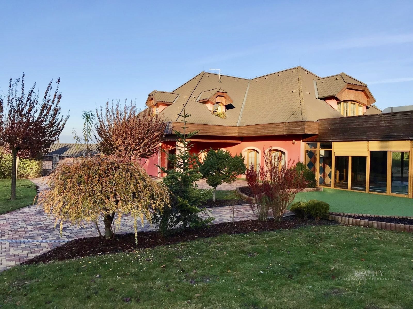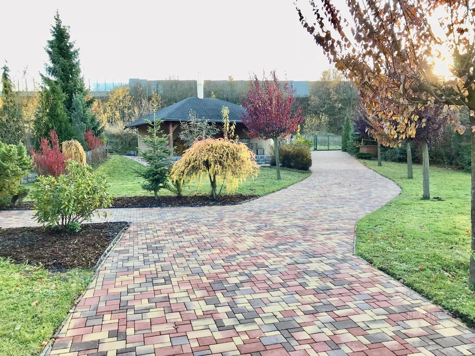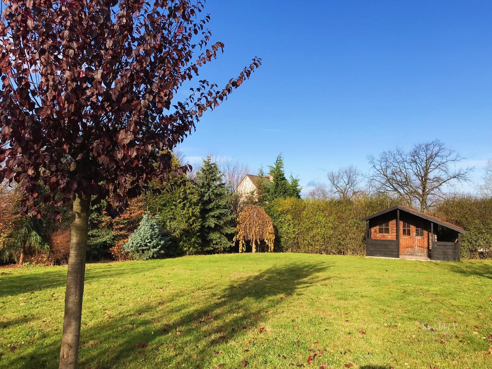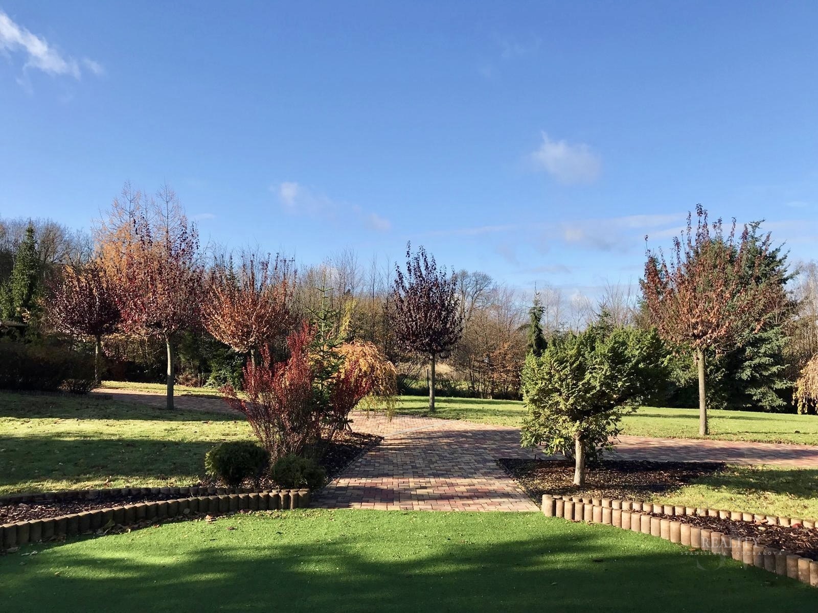 Pozemek je kompletně oplocený a nabízí absolutní soukromí. Zahrada je členitá, osázená vzrostlými stromy a okrasnými dřevinami, s několika klidovými zákoutími. Součástí je altán s velkým zděným grilem a posezením. Pohodlí zajišťuje elektrická vjezdová brána, krytá garáž a dlážděné přístupové cesty. Architektura domu klade důraz na propojení interiéru s exteriérem prostřednictvím francouzských oken a obloukových prvků.