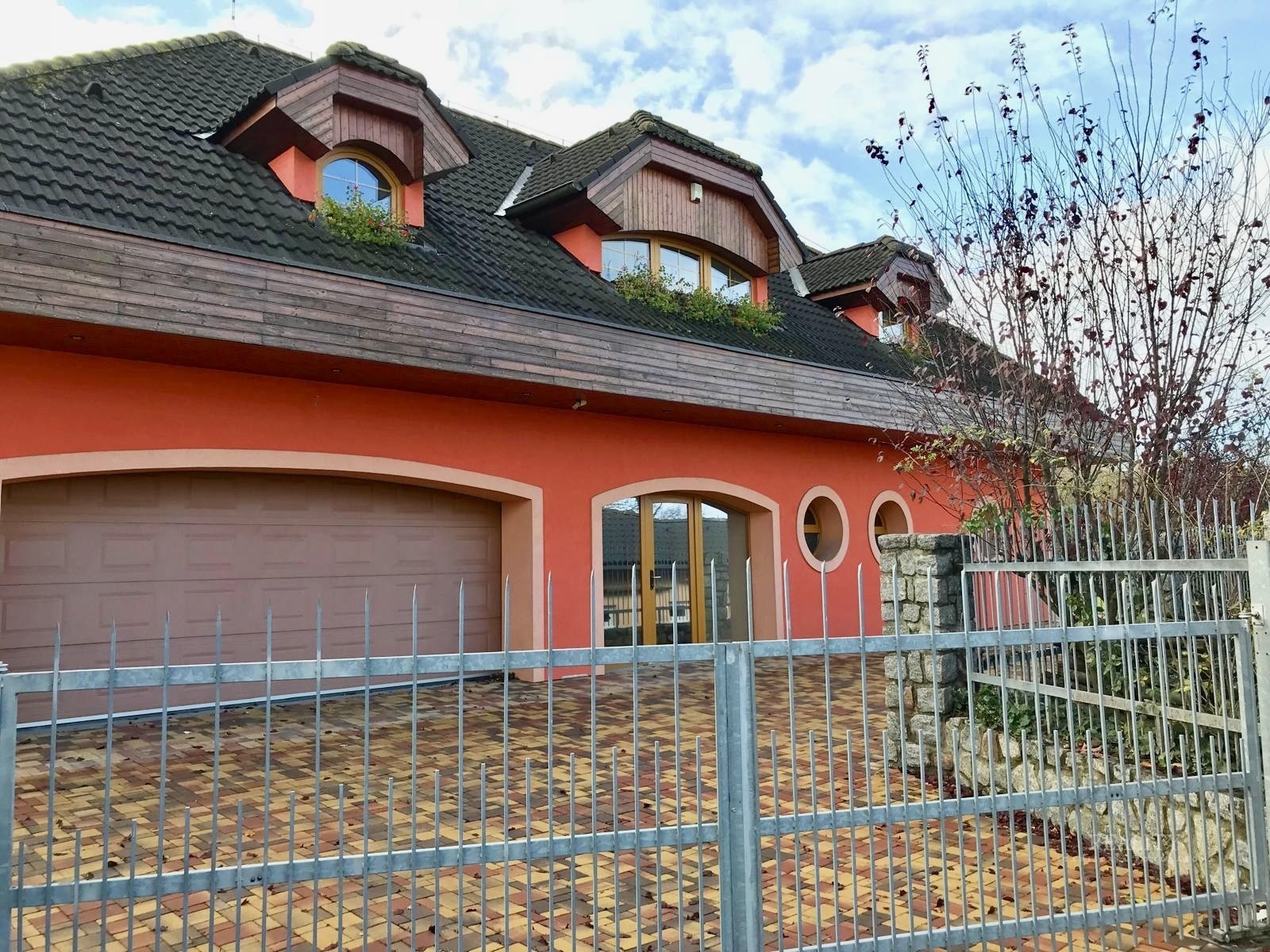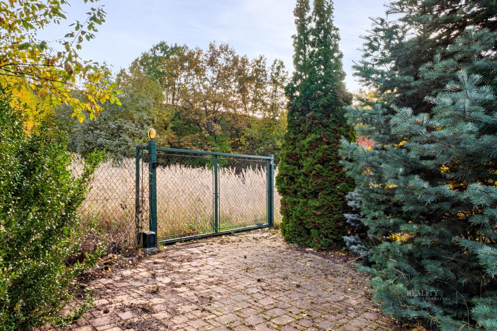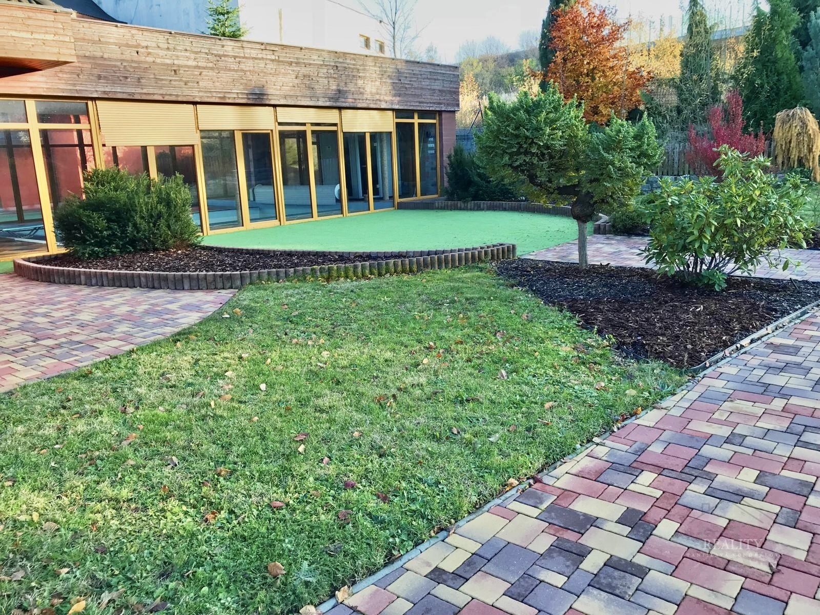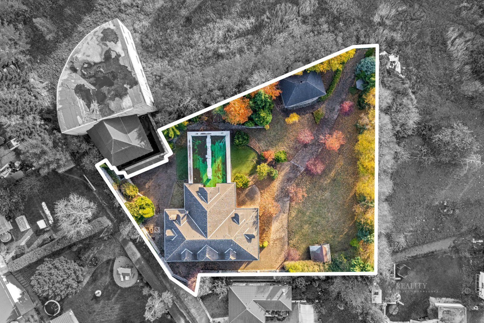 Pozemek je kompletně oplocený a nabízí absolutní soukromí. Zahrada je členitá, osázená vzrostlými stromy a okrasnými dřevinami, s několika klidovými zákoutími. Součástí je altán s velkým zděným grilem a posezením. Pohodlí zajišťuje elektrická vjezdová brána, krytá garáž a dlážděné přístupové cesty. Architektura domu klade důraz na propojení interiéru s exteriérem prostřednictvím francouzských oken a obloukových prvků.