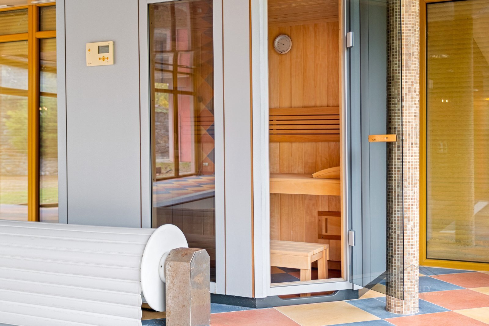 Wellness hala o ploše cca 108 m² není započtena do užitné plochy domu a je uváděna samostatně. Nachází se zde krytý bazén s protiproudem (7,5 × 3,5 m), sauna a relaxační zóna. Přímý vstup z domu umožňuje pohodlné celoroční využití.