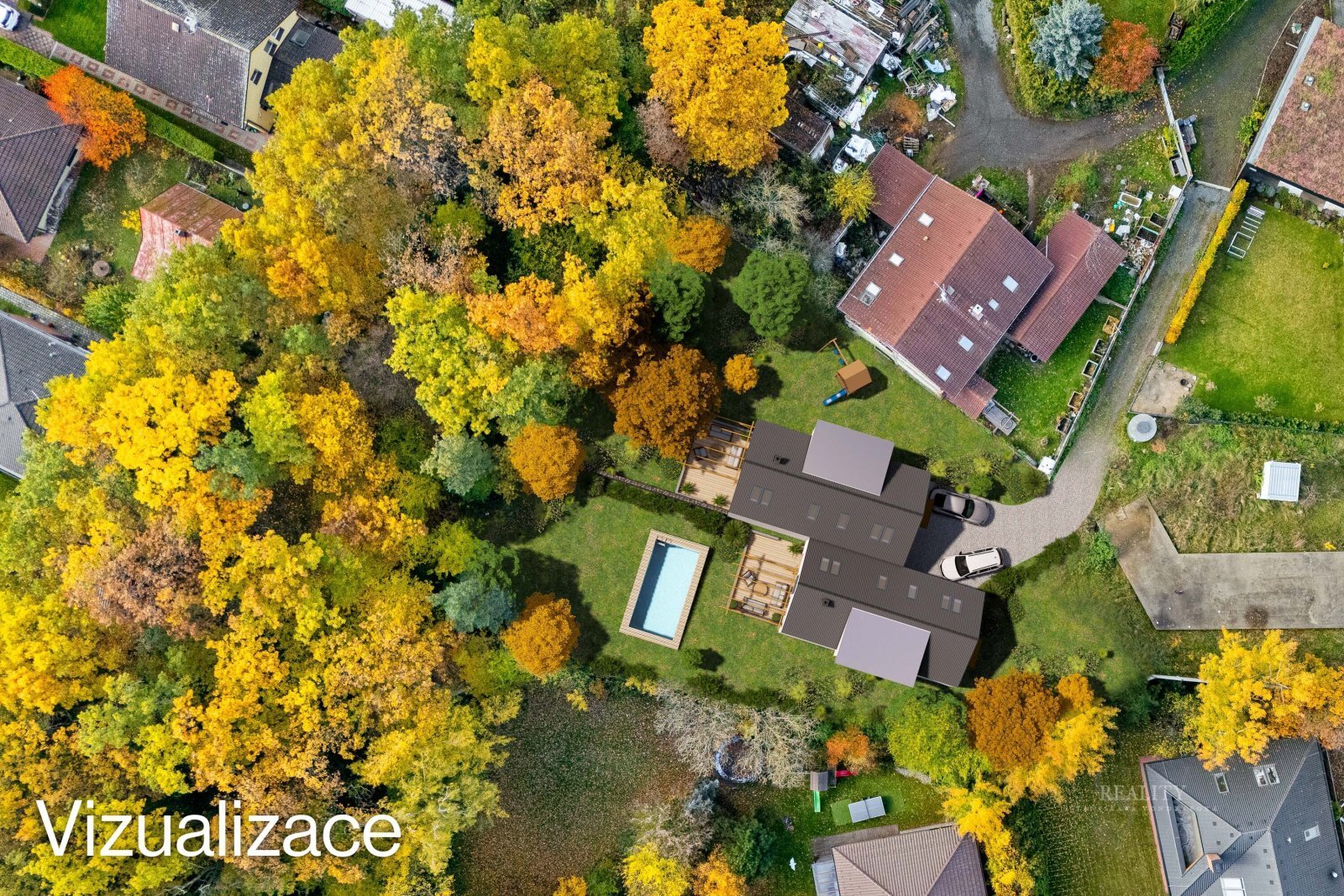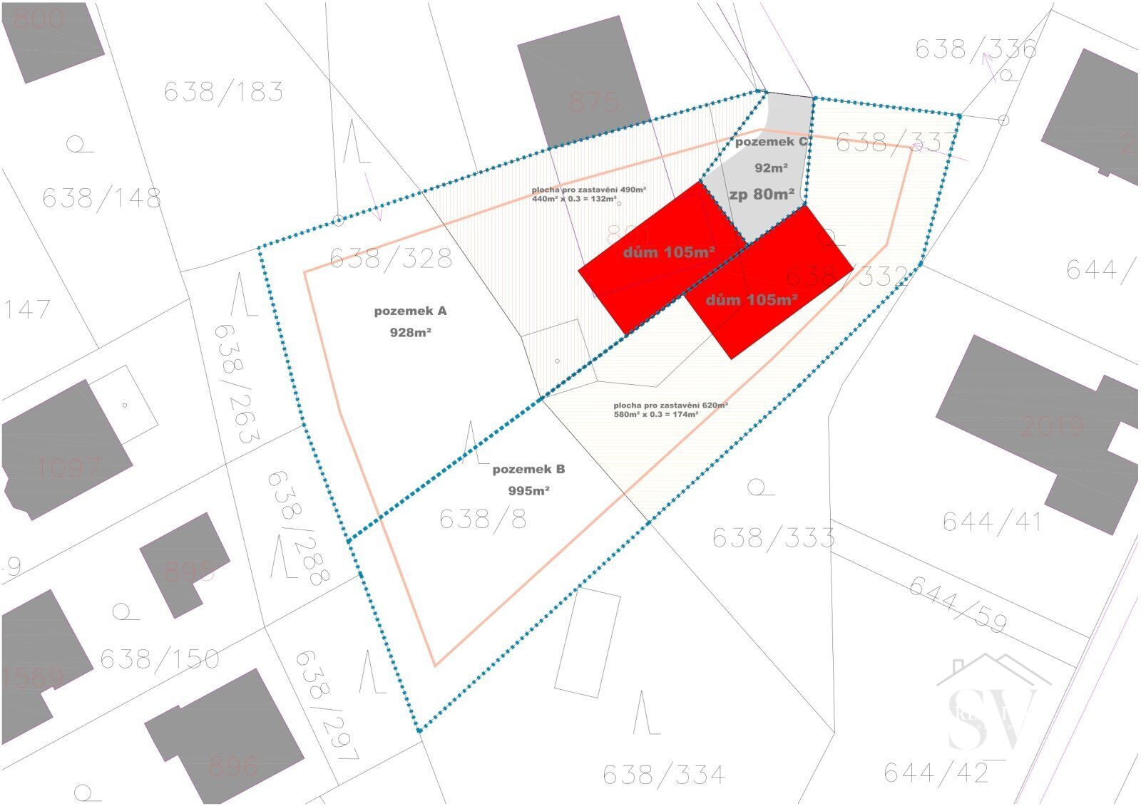 V souladu s územním plánem lze zastavět až 30 % celkové plochy, tedy přibližně 333 m², což odpovídá výstavbě dvou rodinných domů o zastavěné ploše kolem 105 m² každý.Nové rodinné domy mohou mít maximálně dvě nadzemní podlaží a podkroví nebo rovnou střechu, čímž zůstane zachován jednotný charakter okolní zástavby. Pozemek s částí vzrostlých stromů nabízí naprosté soukromí i přirozený kontakt s přírodou. K dispozici je architektonické zpracování návrhu, které řeší umístění dvou samostatných rodinných domů se zahradami, zpevněnými plochami a příjezdovou cestou. Pro lepší představu je k nabídce připravena i vizualizace, která bude součástí videoprezentace.
