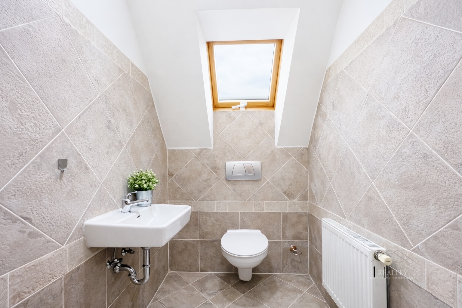 Vytápění a ohřev vody zajišťuje plynový kotel s rozvodem do radiátorů. Ve všech místnostech jsou střešní okna s roletami.